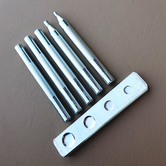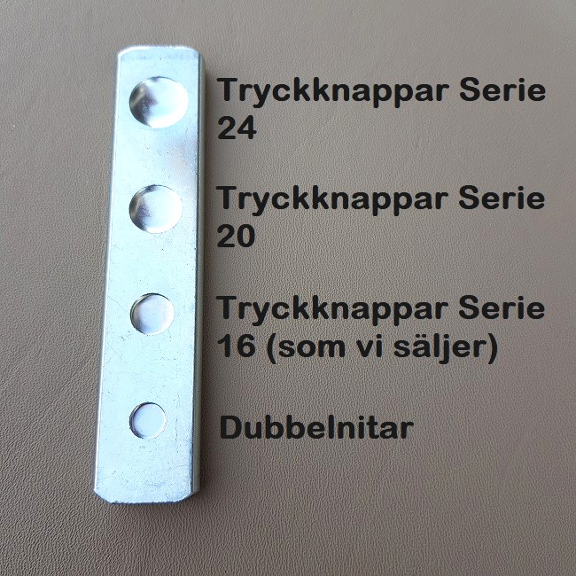 Setet består av 6 delar som behövs för att montera olika dubbelnitar och tryckknappar.