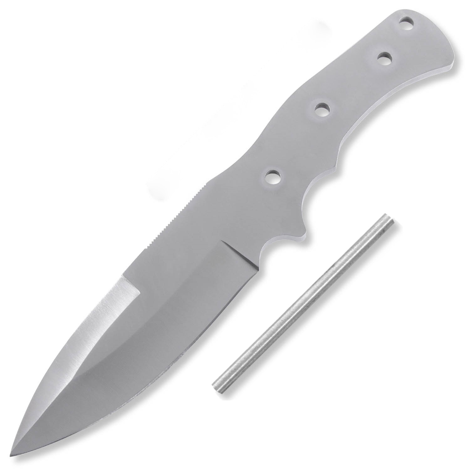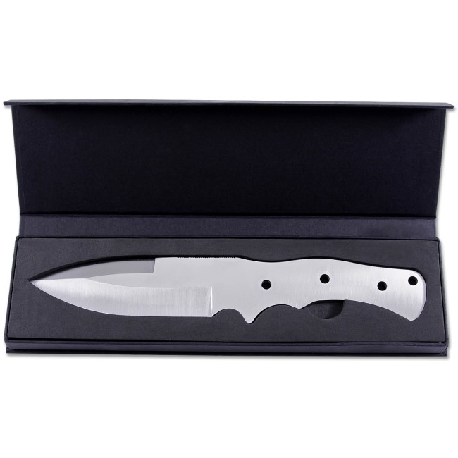 Knivblad Spear Point med hollow slipfas, blank finish av det rostfria stålet AUS8. Till detta knivblad medföljer en 7 cm tillhörande rostfri stålstav. Detta knivblad är helt färdigt, härdat och skarpslipat (ej på ovansidan). Levereras in en snygg, kraftig låda vilket passar extra bra om du önskar ge bort detta knivblad i present.